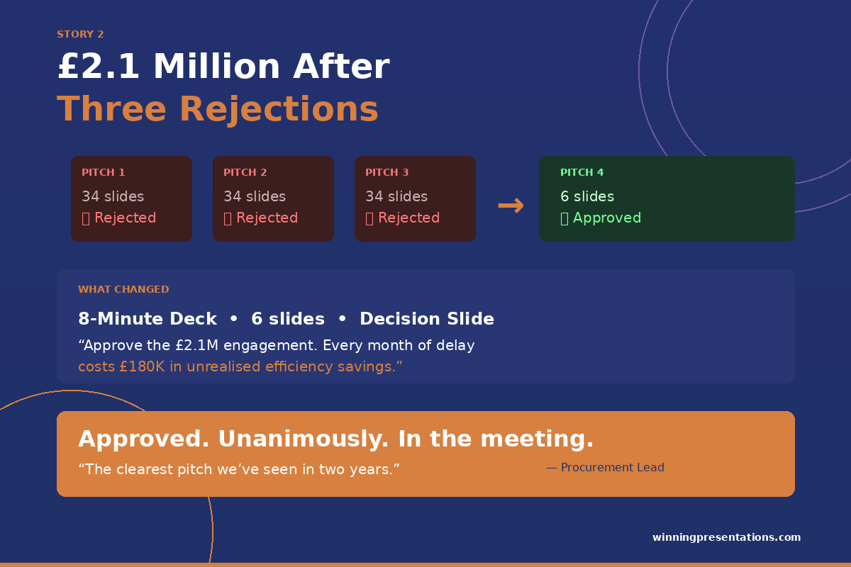 The before: James runs a growing tech consultancy. He’d pitched for a major public sector contract three times. Three times rejected. His proposals were detailed, thorough, technically excellent — and 34 slides long.