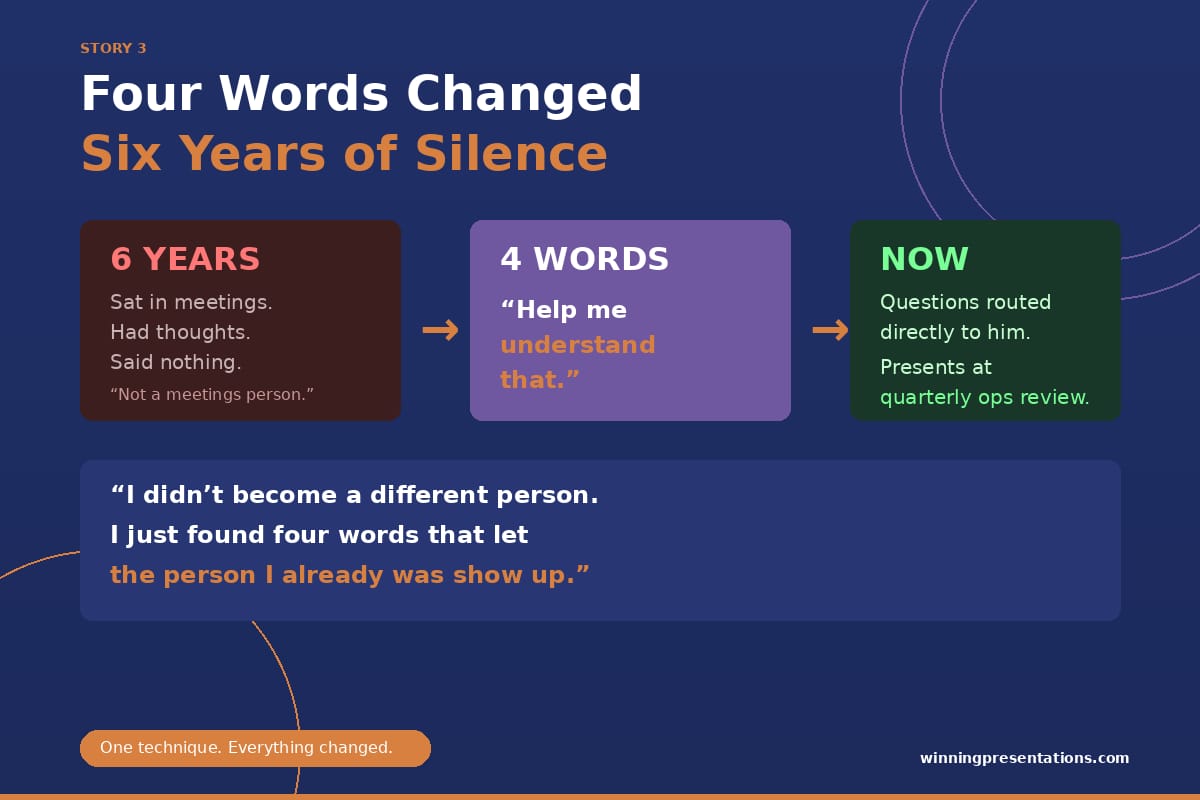 The before: Daniel is a data analyst at a logistics company. Good at his job. Invisible in meetings. For six years, he’d sit in team meetings, have thoughts, say nothing, and then email his ideas to his manager afterwards. His manager would present them as the team’s ideas. Daniel’s contributions were real but invisible.
