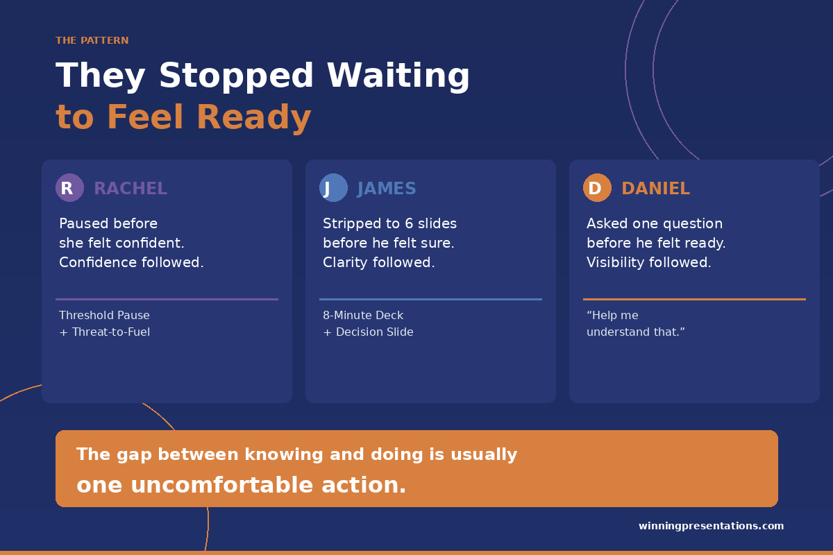 Fill in the “After” column honestly. Even small shifts count. Especially small shifts. Rachel’s pause was two seconds. Daniel’s question was four words. James cut 28 slides. None of it was dramatic. All of it was decisive.