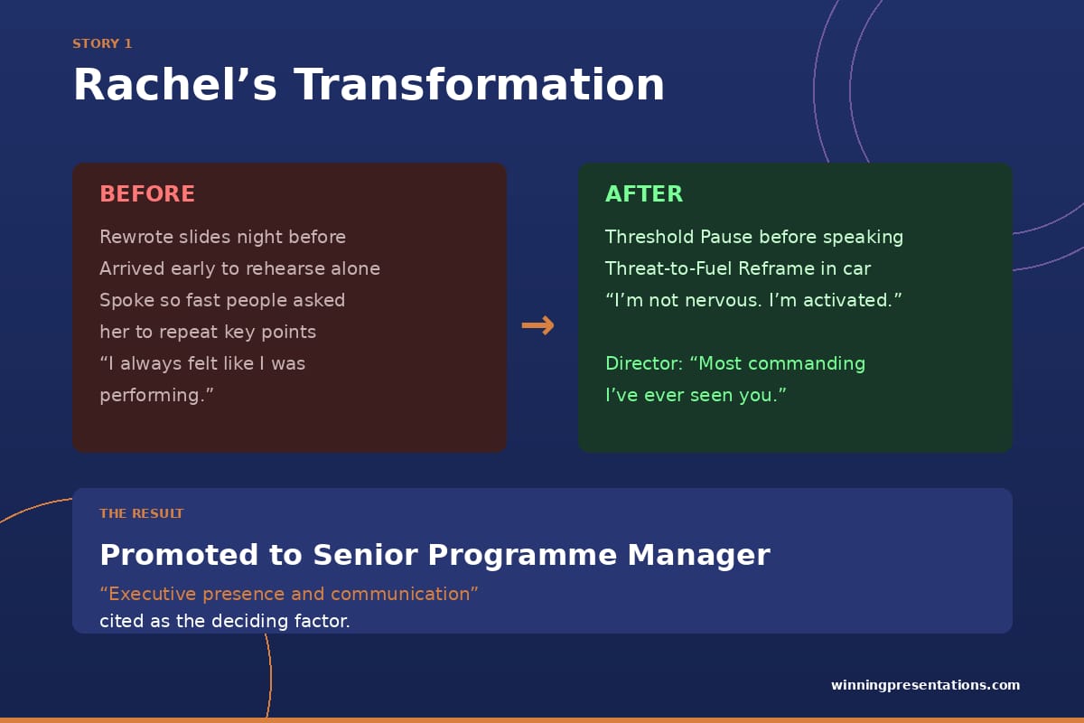 The before: Rachel is a programme manager at a financial services firm. Smart, thorough, excellent at her job. But every time she had to present — even a five-minute update — she’d spend the night before rewriting her slides, arrive early to rehearse alone in the meeting room, and then speak so fast that her colleagues would ask her to repeat key points.
