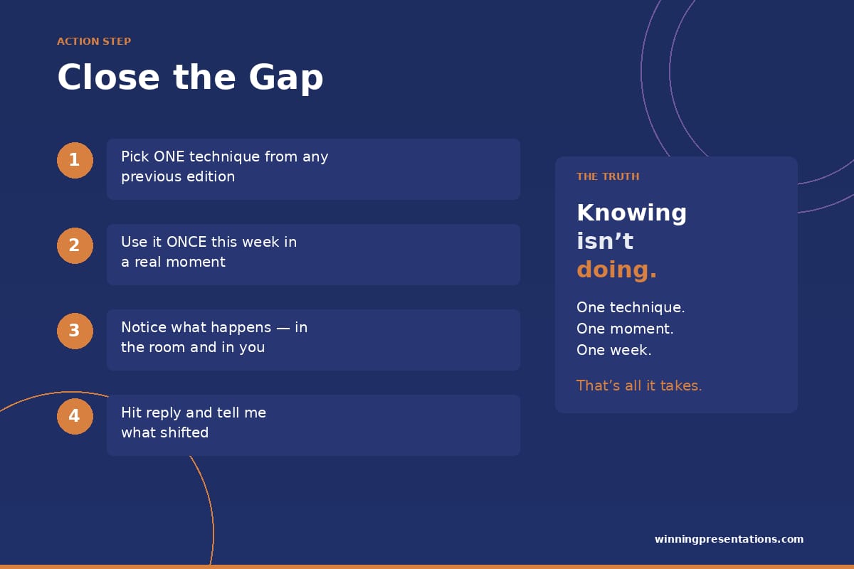 This is the gap between knowing and doing. Every one of you reading this knows techniques that would change how you show up at work. You’ve saved them. Highlighted them. Agreed with them.