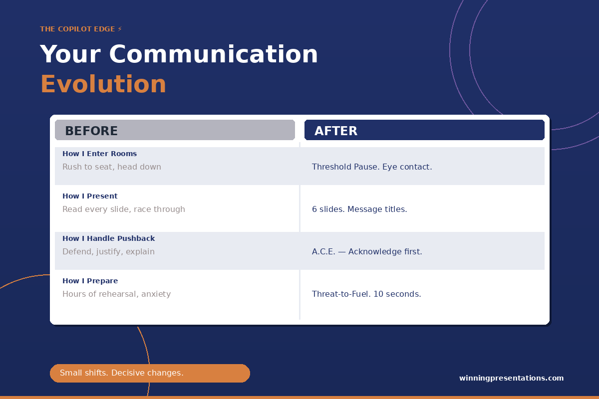 “Create a single slide titled ‘My Communication Evolution.’ Two columns: ‘Before’ (left, grey background) and ‘After’ (right, navy background with white text). Include 4 rows: How I Enter Rooms, How I Present, How I Handle Pushback, How I Prepare. Pre-fill the ‘Before’ column with common defaults (e.g. ‘Rush to seat, avoid eye contact’). Leave the ‘After’ column for me to fill in with my real progress. Professional design. This is for personal reflection.”
