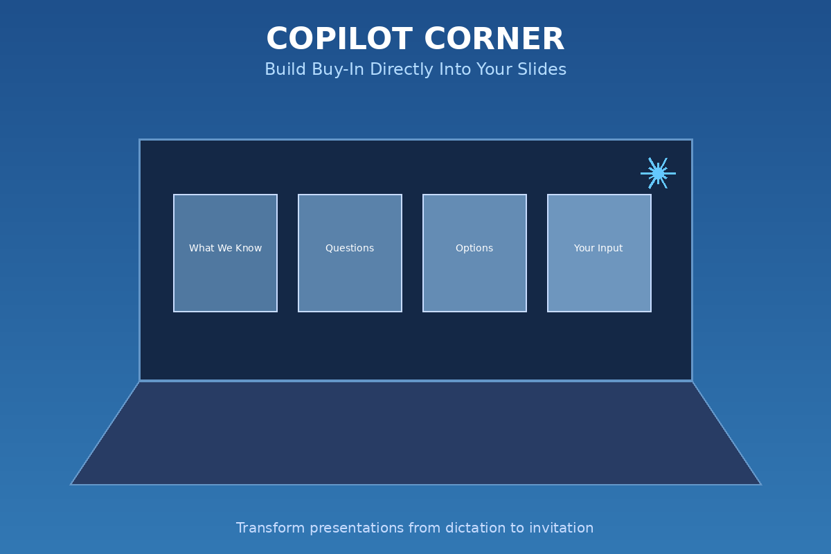 "Create a 4-slide structure for [topic]: (1) 'What We Know' – shared knowledge, (2) 'Questions We're Facing' – open problems, not solved issues, (3) 'Options Considered' – show you've thought alternatives, (4) 'Where We Need You' – specific areas for their input. Headlines should be questions, not statements."