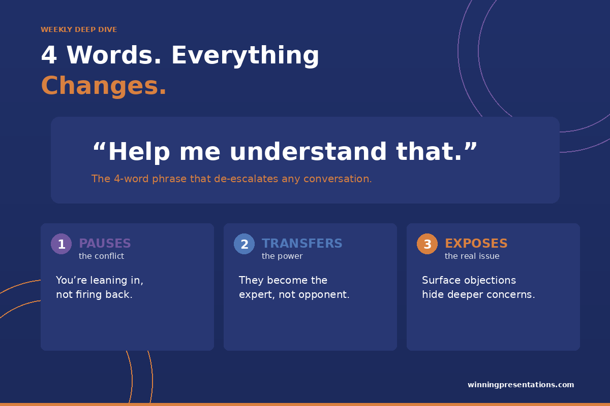 3. It exposes the real issue. Most objections are surface-level. The real concern is underneath. When someone says “This timeline is unrealistic,” the actual worry might be resourcing, or risk, or a previous project that went badly. “Help me understand that” gets you to the real conversation.