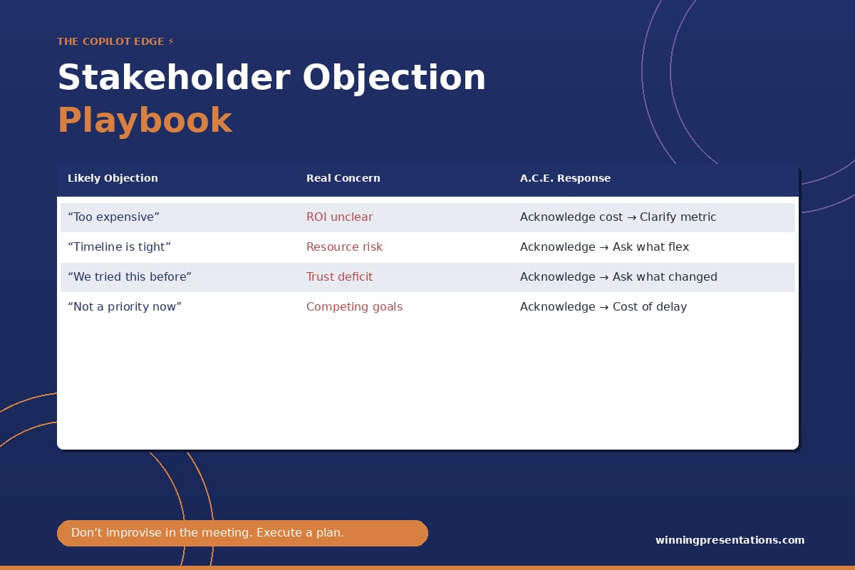 “Create a single slide titled ‘Objection Response Playbook’ with a 3-column table. Column 1: Likely Objection (list 6 common pushbacks for [YOUR TOPIC/PROPOSAL]). Column 2: The Real Concern Underneath (what they’re actually worried about). Column 3: A.C.E. Response (Acknowledge, Clarify question, Elevate with reframe). Professional design with navy headers. This is for my personal preparation before a stakeholder meeting.”