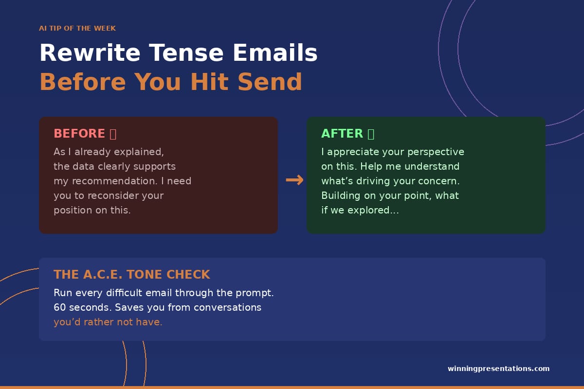 Run every difficult email through this prompt before sending. It takes 60 seconds and it will save you from conversations you’d rather not have.