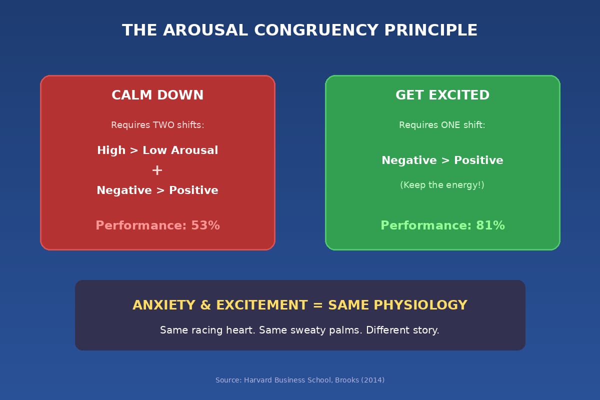 📊 Stat: 90% of people believe "calm down" is the best strategy for pre-performance anxiety. But telling yourself to calm down when you're already aroused is like trying to stop a car by hitting the accelerator and brake simultaneously. (Harvard Business School, 2014)